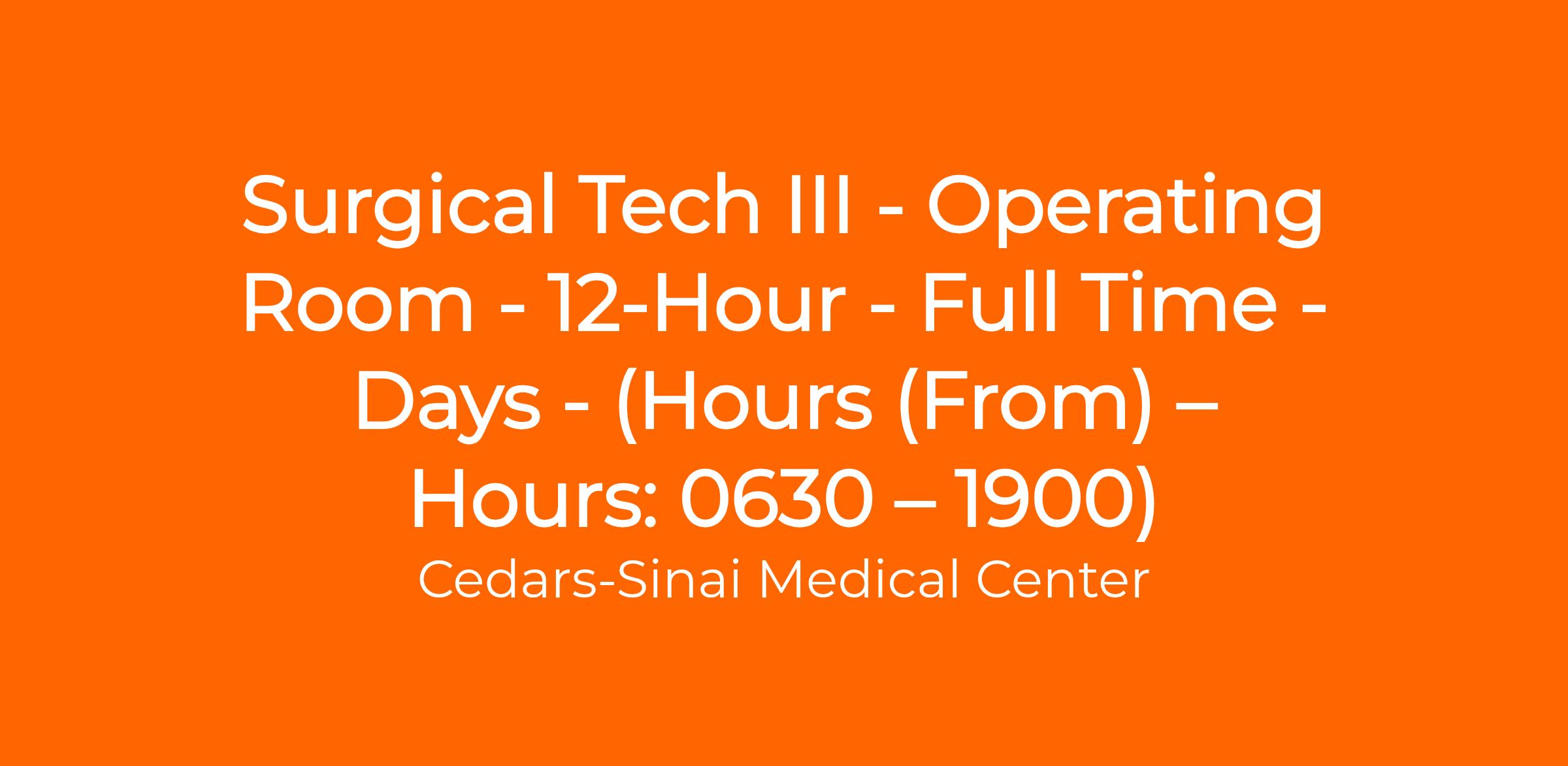 Under the general direction of a licensed caregiver, the Surgical Technologist III assists in surgical operations. The Surgical Technologist III is assigned technical duties, prepares operating rooms, arranges equipment, assists with procedures, and has the responsibility to ensure smooth teamwork through the application of knowledge and effective communication with registered nurses, patients, surgeons, anesthesiologists, ancillary personnel, and other health care team members. The Surgical Technician III provides care consistent with CSMC and accrediting bodies' standards. The Surgical Technician III maintains competency skills including the ability to deliver care to special patient populations and patients with diverse cultural backgrounds. The Surgical Technician III identifies the ability of the adolescent, adult, and geriatric patients to follow instructions and give consent.