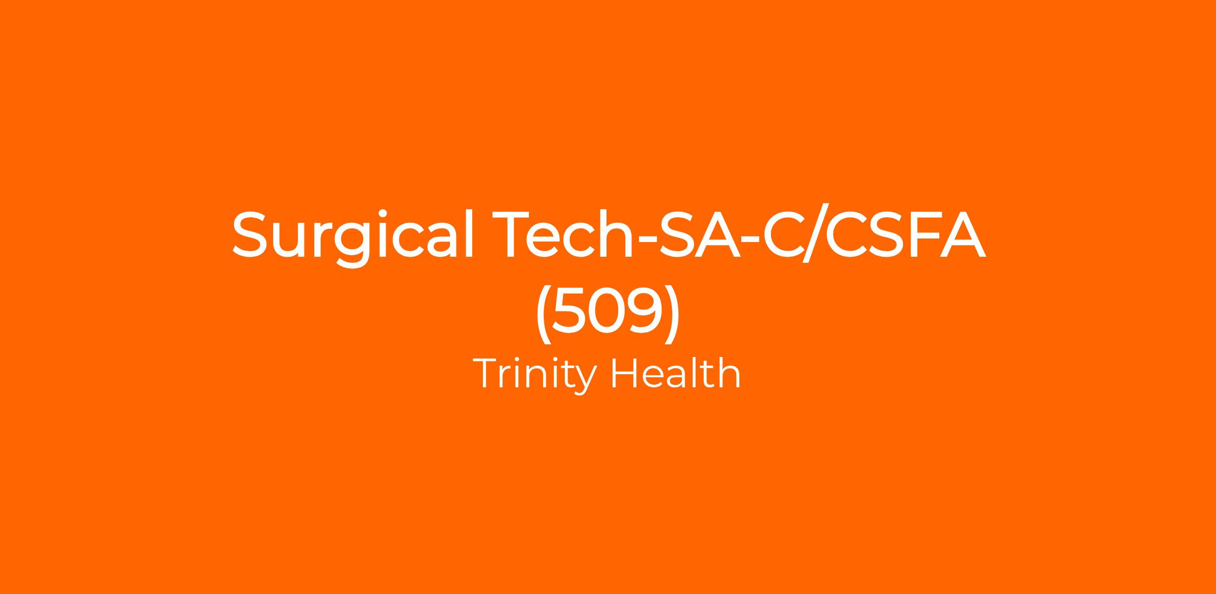 The Surg Tech-SA-C/CSFA is responsible for assisting the surgeon under direct and indirect supervision throughout the procedure. The Surg Tech-SA-C/CSFA works under the direct supervision of the RN circulating nurse, and under the indirect supervision of the Registered Nurse in charge, the Unit Manager of Surgery, and the Director of Surgical Services. The primary job duties include setting up and maintaining a sterile field for patients in the patient population served. The Surg Tech-SA-C/CSFA will assist the surgeon, circulating nurse, and other members of the surgical team as needed and perform other related duties as assigned. They will maintain familiarity with the function and proper care of all equipment and instruments. All of the job duties and standards within this document will be performed according to established policies and procedures, and guidelines within the surgery department and Trinity Hospital.