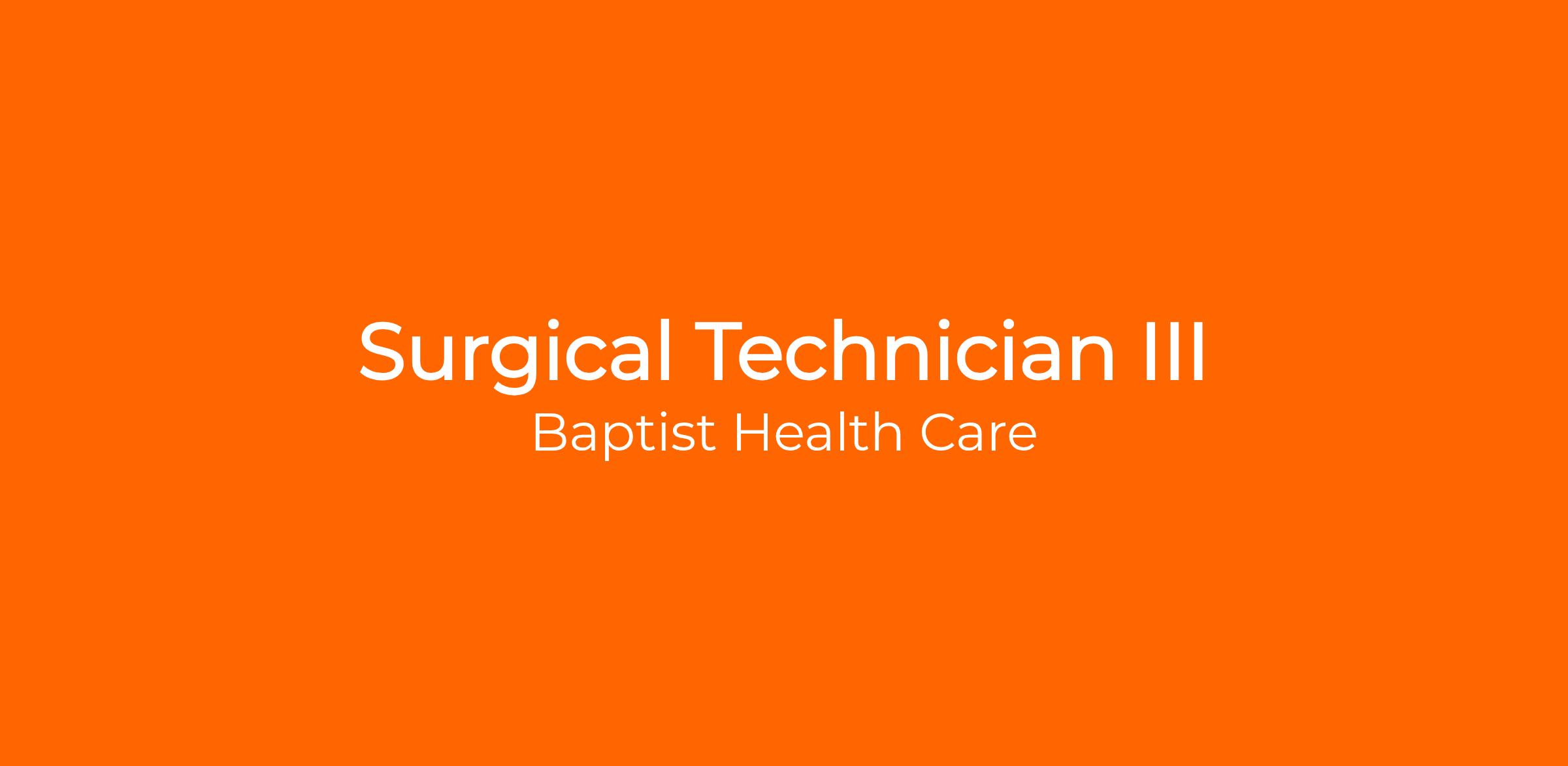 DescriptionThe Surgical Technician III performs technical skills and provides assistance to surgeons, anesthesia personnel, registered nurses, and other professionals in the operating room. This position works under the supervision of the registered nurse in delivering safe, effective care to the patient during the intra operative period. This position effectively interacts with patients and health care team members, while maintaining the surgical department standards; participates in surgical procedures on patients of all age groups, pediatric through geriatrics: may assist in circulating duties under the direct supervision of a qualified registered nurse.