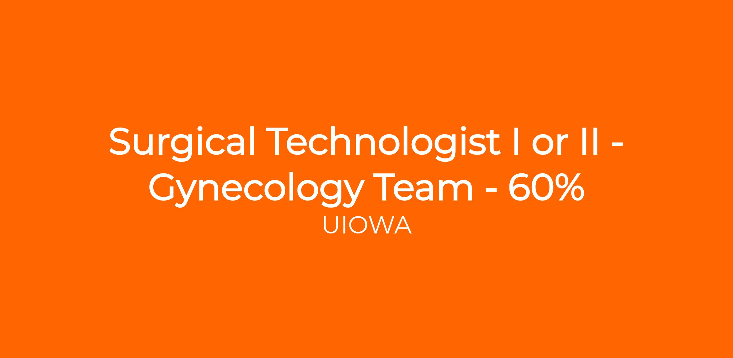 The University of Iowa Heath Care Department of Perioperative Services, is seeking 60% Surgical Technologist I or II for the Gynecology Team. Surgical Technologists assist with surgical procedures, provision of therapeutic, preventive, and emergency patient care duties. Prepares, operates, and maintaines routine and complex equipment, instruments, supplies and implants. All duties are done under the direction of a registered professional nurse.